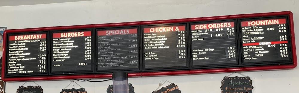 Giant Burger features a diverse menu with American classics. Breakfast items include pancakes and omelets, perfect for morning cravings. Burgers shine on the menu, especially the giant burger, paired with sides like chili cheese fries. Chicken sandwiches and steak sandwiches cater to varied tastes, adding depth to the offerings.